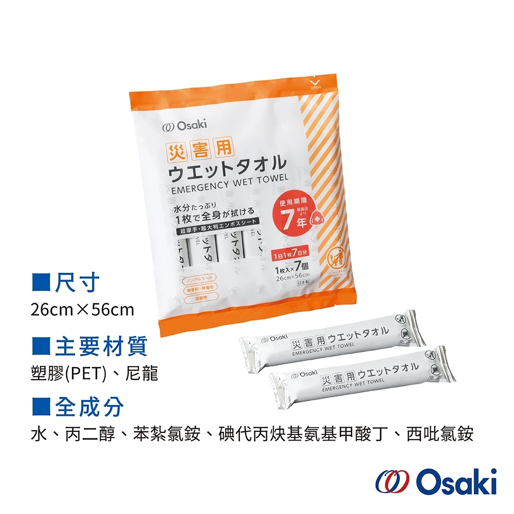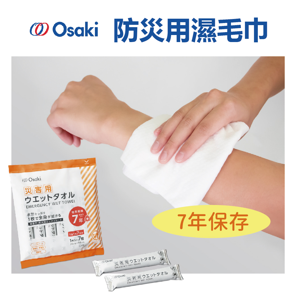 日本製大崎醫療7年保存濕巾,專為防災儲備設計,獨立鋁膜包裝,長期保存無虞。