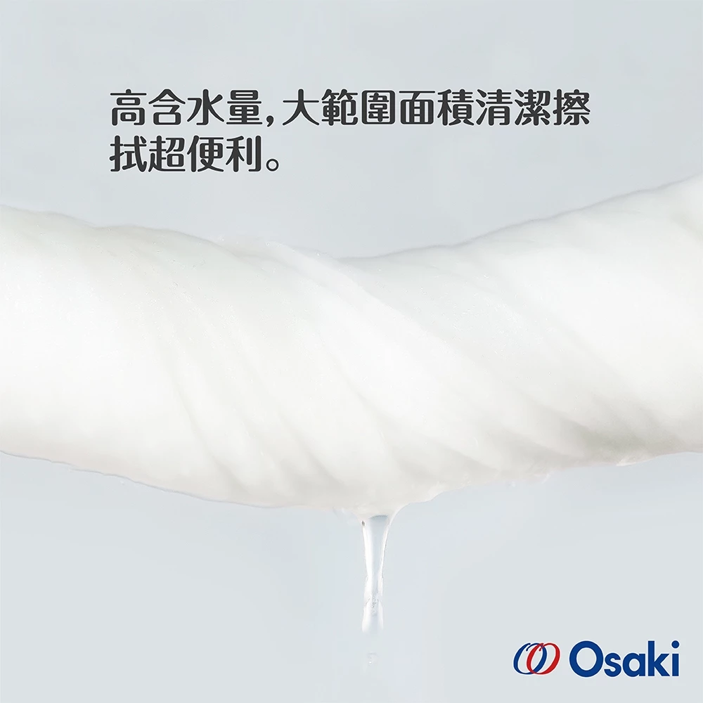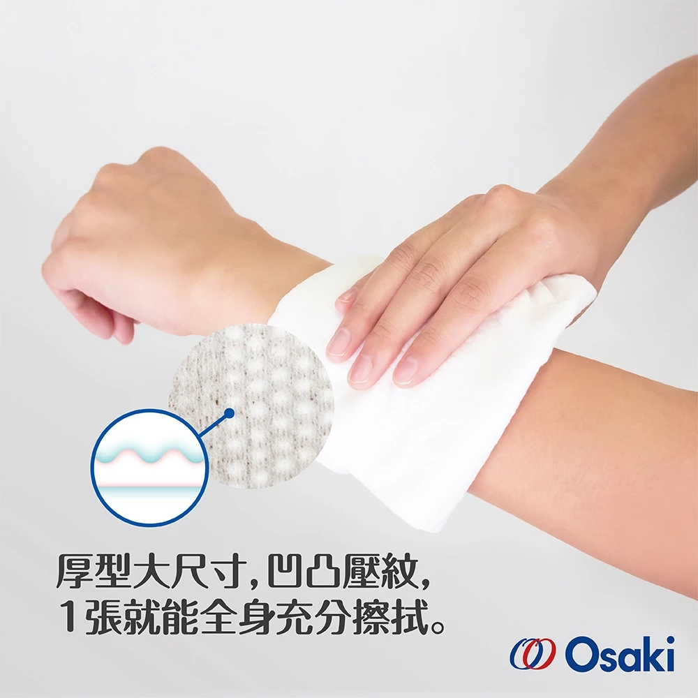 使用超大尺寸厚實壓紋濕巾,一片即可擦拭全身。