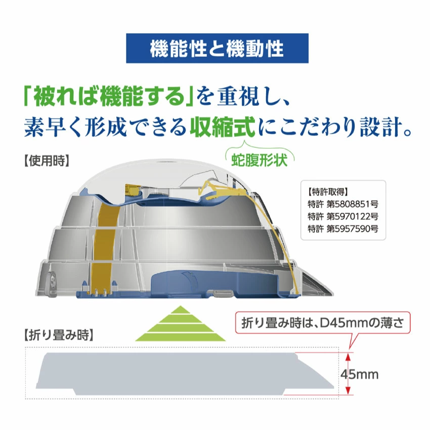 主要機能 : 一秒展開的蛇腹式結構(日本專利) 專為「快速配戴」設計,兩側按壓即可自動形成完整帽體